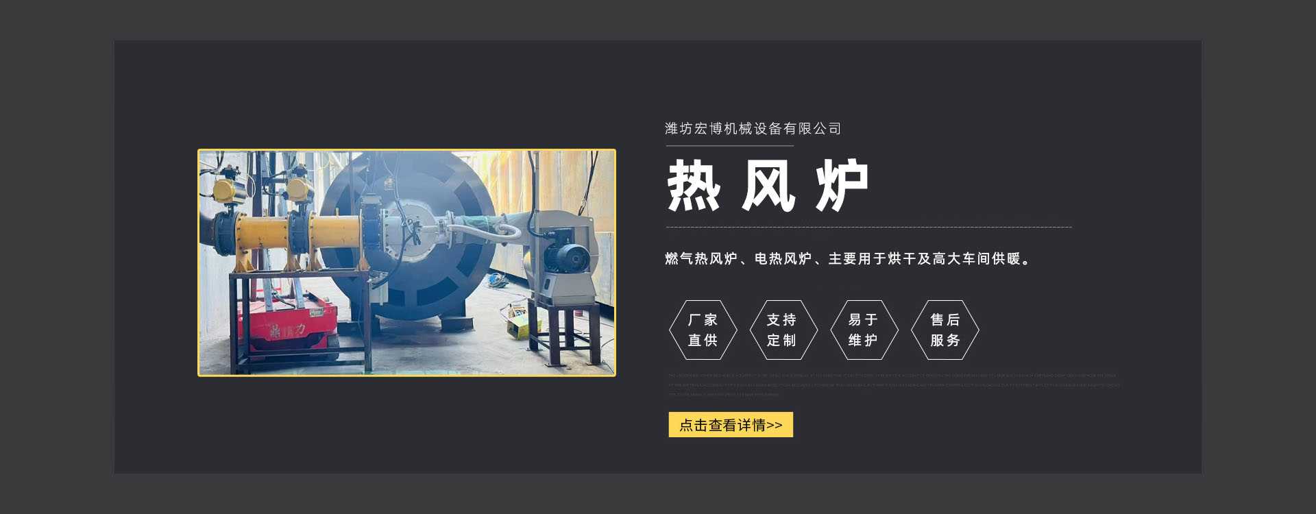 濰坊宏博機(jī)械設(shè)(shè)備有限公司是從事熱風(fēng)爐、烘干設(shè)(shè)備、供暖設(shè)(shè)備的研發(fā)(fā)、設(shè)(shè)計(jì)、制造和服務(wù)(wù)于一體的實(shí)體企業(yè)(yè)。長(zhǎng)期以來,企業(yè)(yè)以市場(chǎng)的發(fā)(fā)展和客戶的需求為導(dǎo)向,集多年的生產(chǎn)(chǎn)技術(shù)(shù)與經(jīng)(jīng)驗(yàn)為一體,不斷開發(fā)(fā)和優(yōu)(yōu)良產(chǎn)(chǎn)品。